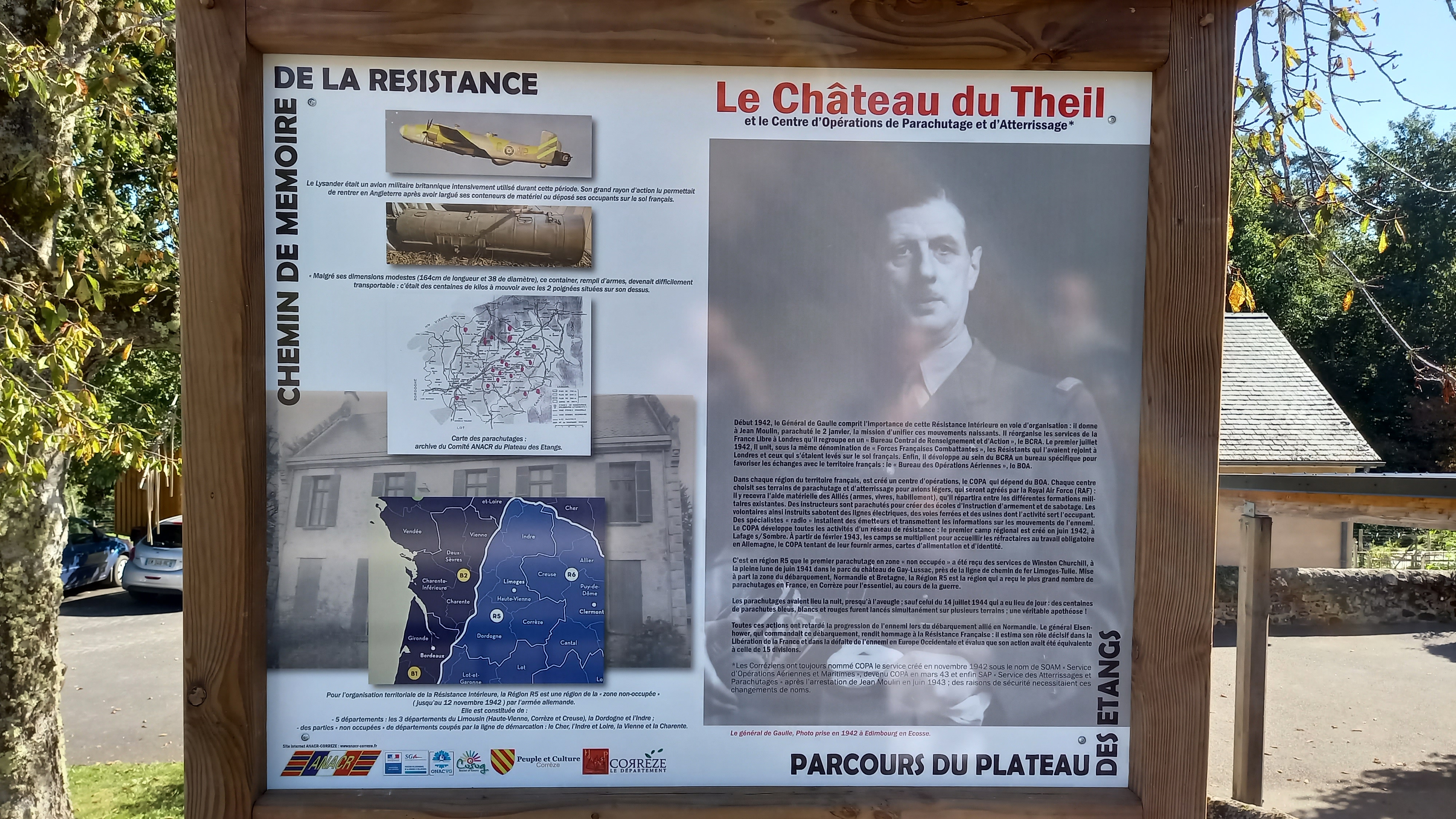 Le premier panneau est intitulé « Le Château du Theil et le centre d’opérations de parachutage et d’atterrissage ». En fond, une photo du Général de Gaulle prise en 1942, année où il a réorganisé la France Libre à Londres. Le texte de ce panneau expose les conséquences de cette réoganisation avec la création d’un Bureau des Opérations Aériennes BOA dans chaque région du territoire français, ici en R5.