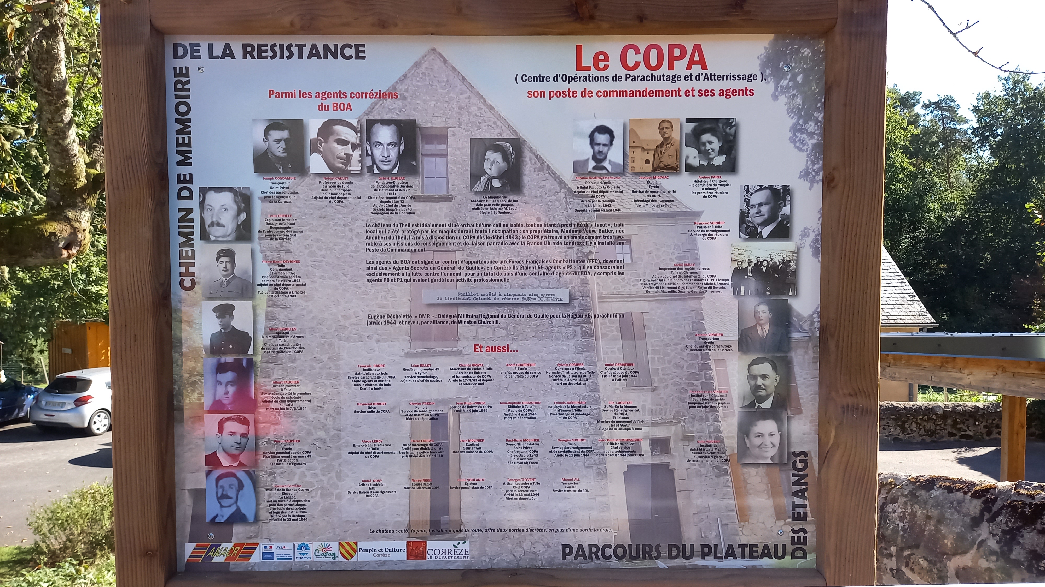 Le second panneau est intitué : « Le COPA, son poste de commandement et ses agents ». La photo de l’arrière du château du Theil est en fond d’image. Les noms de 40 agents du BOA, sont présents sur ce panneau dont 17 avec leur photographie. Cependant, en Corrèze, c’est plus de cent résistants qui ont signé un engagement aux Forces Françaises Combattantes, FFC, crées le 1er juillet 1942, devenant ainsi des « agents secrets du Général ».